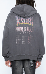 Boxy oversized fit hoodie with a single piece hood front pouch pocket and rats tail detail. Made from a premium loopback fleece in overdyed black with a heavy ombr� aged wash. Featuring screen printed artwork at the front and back and finished with t-box and 4x4 embroidery branding.