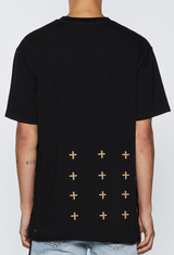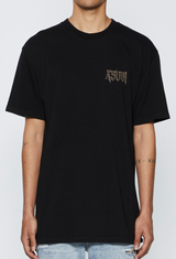 Boxy oversized fitting short sleeve t-shirt with a dropped shoulder and raw cut back hem. Detailed with a reversed overlocked side seam signature rats tail and branded logos. Made from a premium heavy weight cotton jersey in an overdyed faded black with an aged wash. Featuring seasonal digitaly printed artwork at the front and back and finished with t-box and 4x4 embroidered branding.