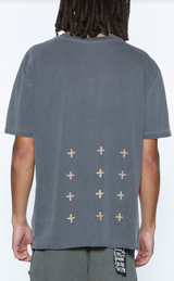 Oversized fit short sleeve t-shirt with raw-cut back hem reverse overlocked side seam and signature rats tail. Made from a premium cotton jersey in an overdyed charcoal grey with an aged wash. Features front screen printed seasonal artwork at the front. Finished with signature t-box and 4x4 branding.